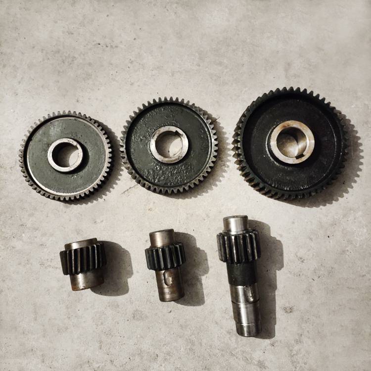 滾筒式JZM500混凝土攪拌機(jī)變速箱全套齒輪,有23/17/18齒軸,54/51/50齒盤齒輪,及減速機(jī)輸出軸配件。JZM500型攪拌機(jī)減速機(jī),安裝在滾筒式膠輪摩擦傳動(dòng)JZM500型混凝土攪拌機(jī)的兩側(cè),通常配套兩臺(tái)5.5KW攪拌電機(jī)雙驅(qū)動(dòng)使用。減速機(jī)外殼鑄鐵制造,三級(jí)變速,和電機(jī)為直連方式,電機(jī)軸上的小齒輪為23齒斜齒,減速機(jī)內(nèi)部有17齒直齒軸,18齒直齒軸,54齒斜齒盤齒輪,51齒和50直齒盤齒輪。齒輪變速箱輸出軸直徑55mm,鍵槽寬度16mm,中心高約20.5cm,地腳安裝孔距27*28cm。