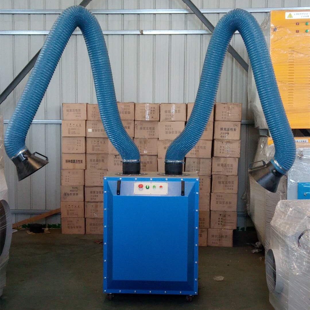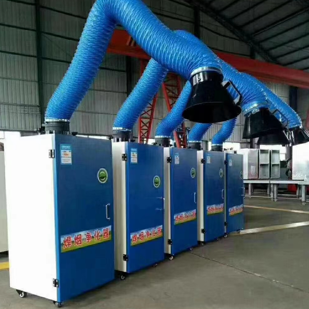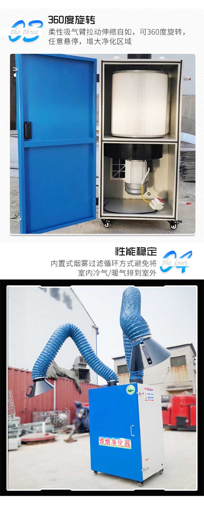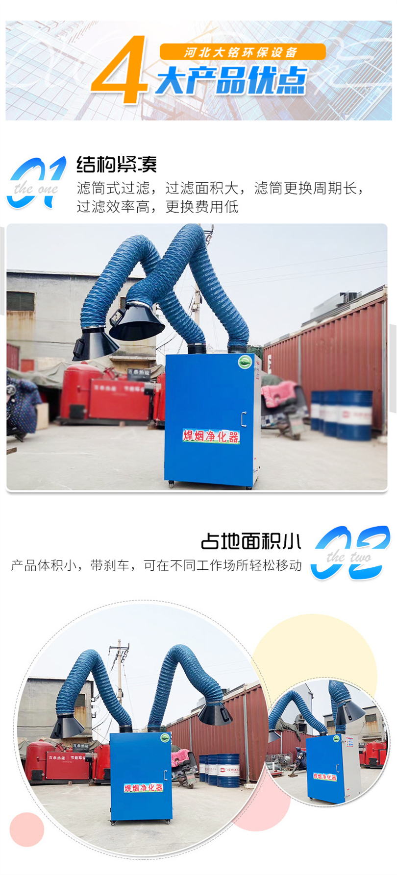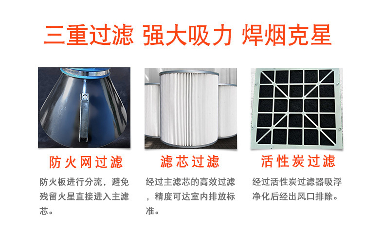 煙塵通過焊煙凈化器產(chǎn)生的負壓由吸氣罩吸入煙塵,經(jīng)柔性吸氣臂進入腔體,流速變慢使大顆粒直徑的粉塵掉落下來,含微細粉塵的氣流進入凈化室內(nèi),粉塵的過濾分離在凈化室內(nèi)通過濾筒的分離作用完成,煙塵則被濾芯阻攔在其表面上,凈化后的空氣經(jīng)風機排出,當被阻攔的煙塵在濾芯表面不斷沉積時,定時開啟脈沖清灰系統(tǒng),手動清灰式需將濾筒取出手工清理。靜電式需定期清洗電極板。