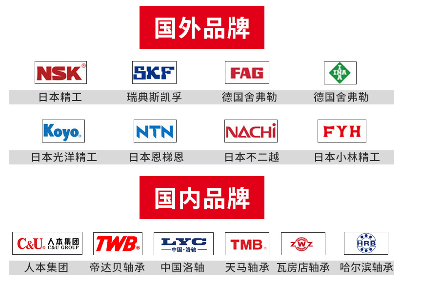 主營品牌:瑞典的SKF、德國FAG/INA、日本NSK 、美國TIMKEN、英國RHP、GAMET、法國的SNR、SNFA德國的GMN、ELGES、STIEBER、NADELLA、SLF、IGUS、SWC;日本的NSK、NTN、IKO、NMB、EASE、KOYO、FYH、ASAHI、IJK、THK、NACHI、EZO、椿本Tsubaki單向離合器軸承;美國的 、TORRINGTON、UBC、林肯bbbb-BELT、道奇DODGE、Fafnir、KAYDON、巴頓BARDEN、麥吉爾MCGILL、SEALMASTER、MRC摩根軸承、ROLLWAY、THOMSON、NHBB、AMI;韓國的SAMICK、KBC
