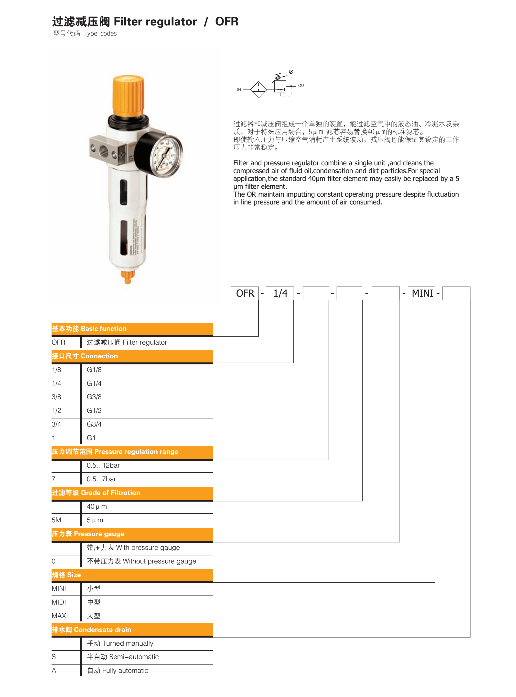 過(guò)濾器和減壓閥組成一個(gè)單獨(dú)的裝置,能過(guò)濾空氣中的液態(tài)油、冷凝水及雜質(zhì),對(duì)于特殊應(yīng)用場(chǎng)合,5μm 濾芯容易替換40μm的標(biāo)準(zhǔn)濾芯。 即使輸入壓力與壓縮空氣消耗產(chǎn)生系統(tǒng)波動(dòng),減壓閥也能保證其設(shè)定的工作壓力非常穩(wěn)定。