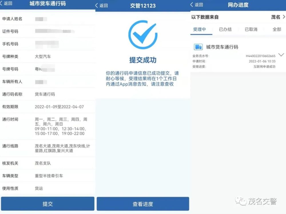 申請?zhí)峤怀晒?,申辦人員在手機上可以查看辦理進度,經公安交警部門審核和審批通過后,申辦人員可以在手機上查看貨車通行碼,如下: