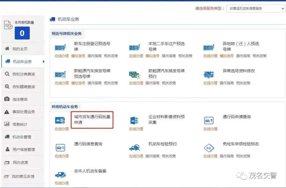 為貫徹落實國務院辦公廳關于降低物流成本、推動物流高質量發(fā)展的部署要求,深入推進公安交管“放管服”改革和城鄉(xiāng)高效配送專項行動、城市綠色貨運配送示范工程,進一步優(yōu)化和改進城市配送貨車通行管理工作,根據公安部、省公安廳交管局的工作部署,茂名市公安交警部門已經于11月1日起正式開通貨車通行碼網上申請辦理業(yè)務,實現全網通辦。經過2個多月的網上申辦貨車通行碼工作的試運行,網絡系統平臺已經逐步完善。為進一步方便有通行需求的個人或者企業(yè)在網上申請辦理貨車通行碼,特制訂該辦事指南。