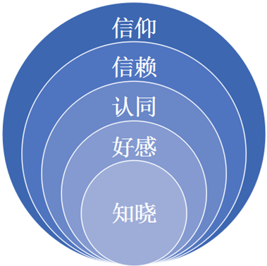 華彩認為品牌管理建設(shè)有五個境界,分別是:知曉、好感、認同、信賴和信仰。