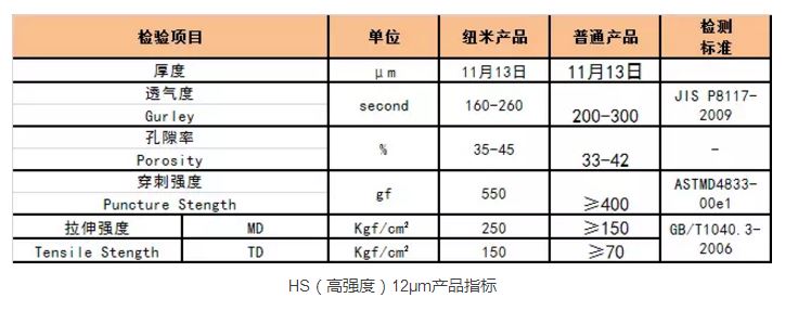 此外,2017年初,紐米科技還將提高產(chǎn)品結(jié)晶度、加強產(chǎn)品分子鏈的取向作為技術(shù)突破口,成功開發(fā)出名為HS(高強度)12μm產(chǎn)品。相比市場同等厚度的隔膜產(chǎn)品,HS(高強度)12μm隔膜在實現(xiàn)強度和耐電壓擊穿能力遠高于市場常規(guī)產(chǎn)品的情況下,保持了隔膜內(nèi)部結(jié)構(gòu)的穩(wěn)定性和孔均勻性。