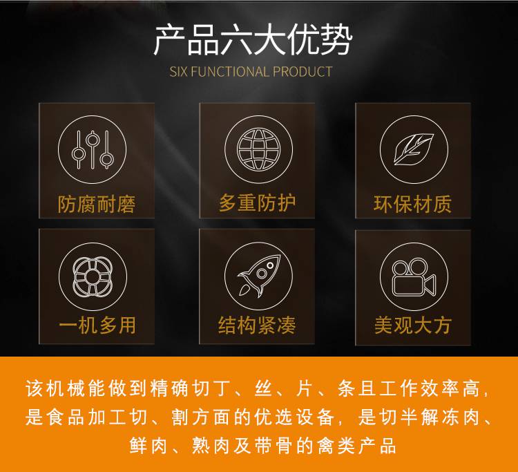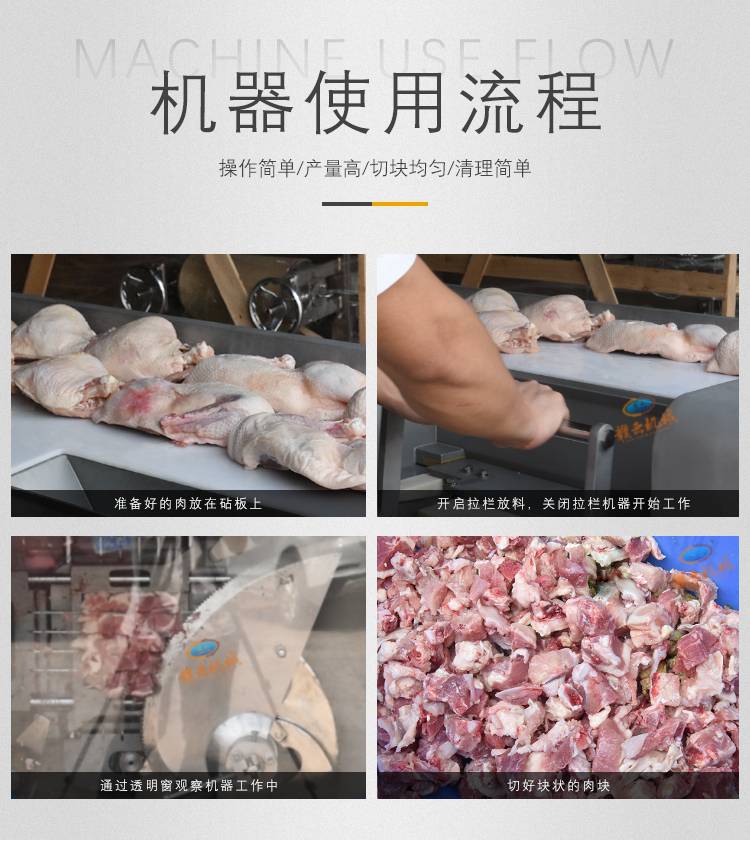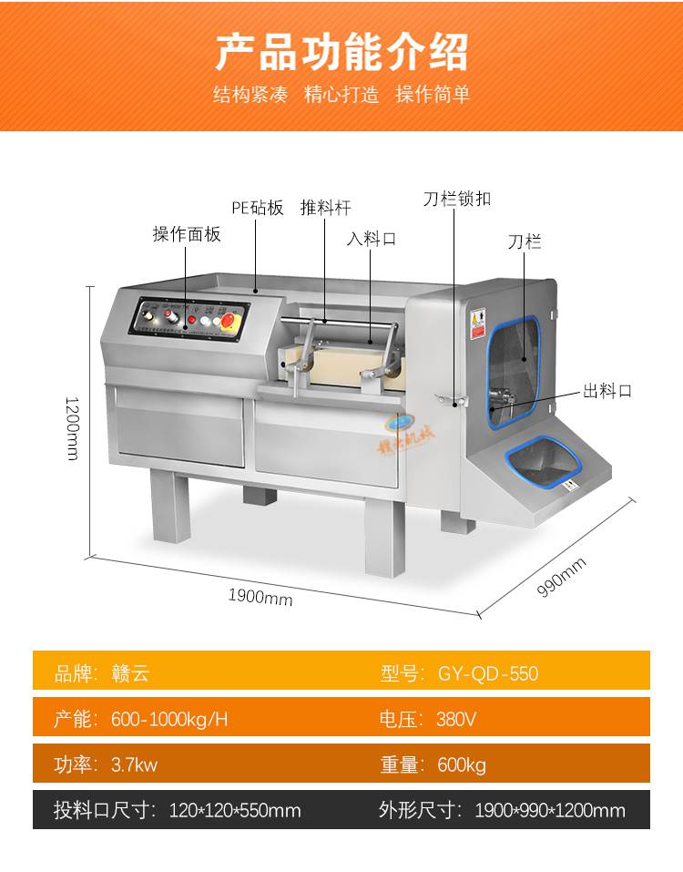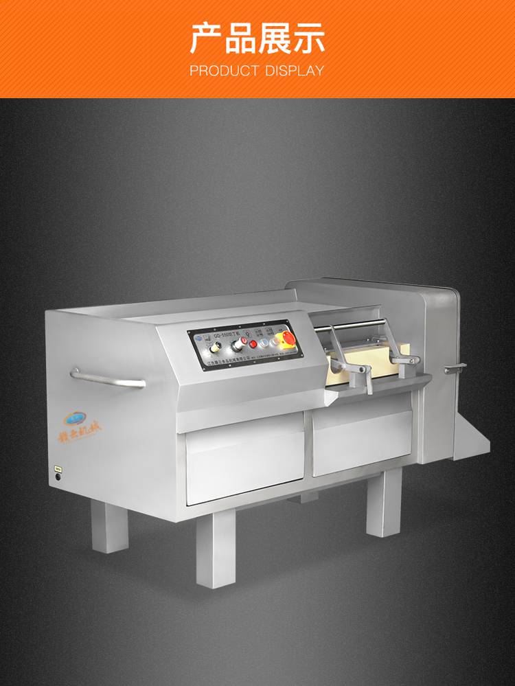 贛云550家禽類(lèi)切丁機(jī)能做到精確切丁,絲,片,條,等加工工序且加工效率高,是食品加工切、割方面的理想設(shè)備;是切半解凍肉,鮮肉,熟肉及帶骨禽類(lèi)的產(chǎn)品;