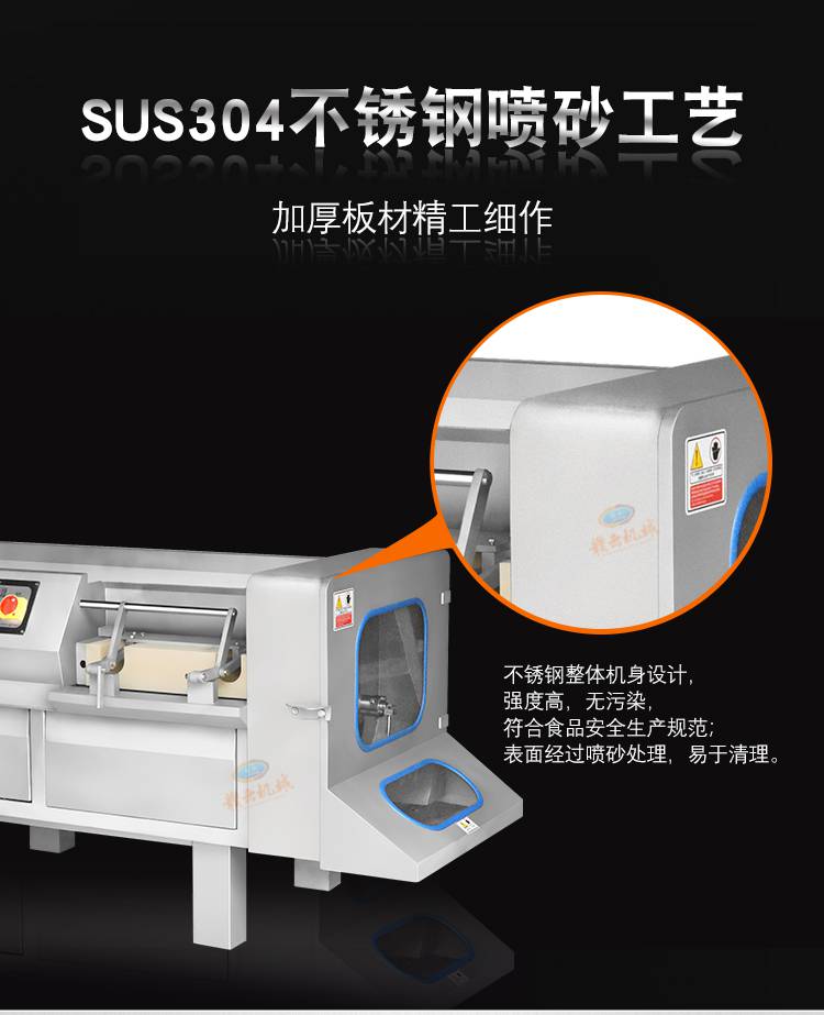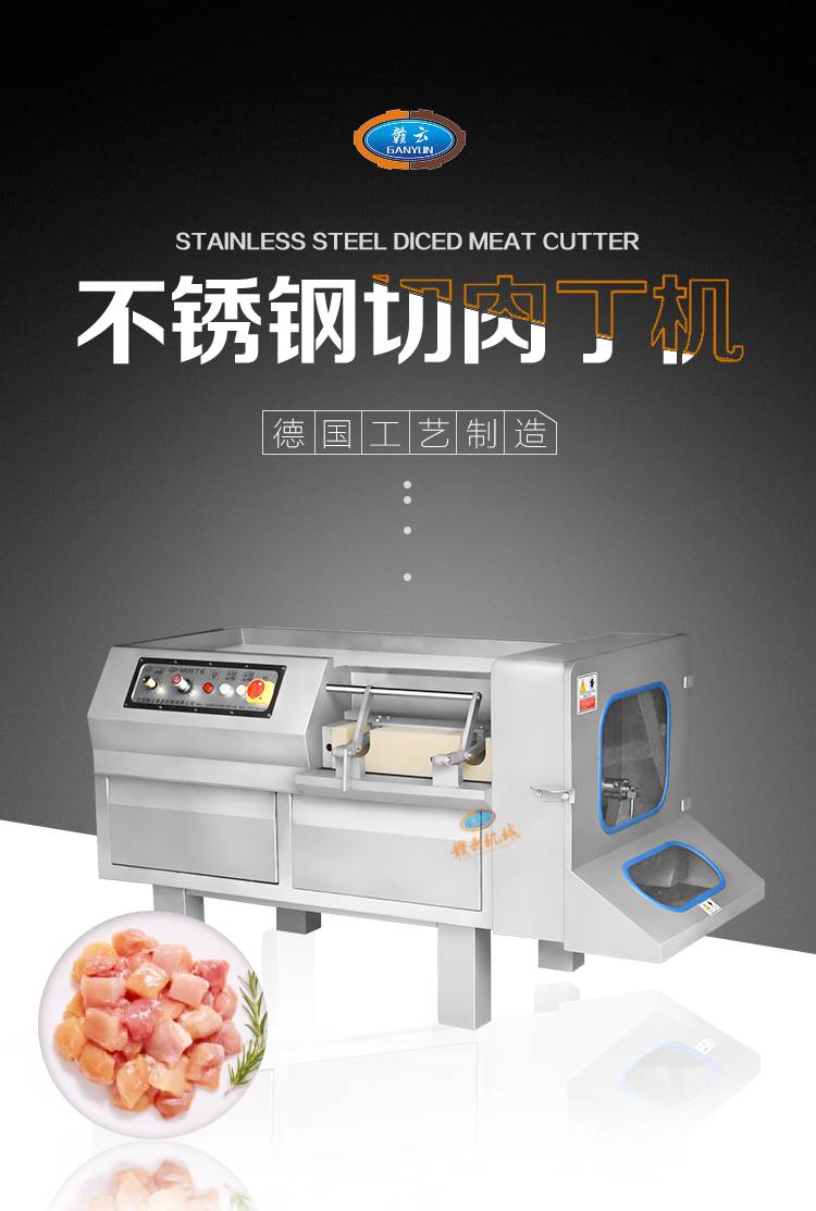 贛云550型切肉丁機(jī)整機(jī)采用SUS304不銹鋼制作;強(qiáng)度高,無(wú)污染,符合食品衛(wèi)生安全生產(chǎn)規(guī)范,表面經(jīng)過(guò)噴砂處理,易于清理,刀俎采用優(yōu)質(zhì)材料,設(shè)計(jì)流暢,刀俎鋒利,高硬度,具有磁化,抗氧化等特點(diǎn),經(jīng)久耐用;操作面板清晰明了,操作方便,切割槽部裝置了應(yīng)器,槽門(mén)打開(kāi)后轉(zhuǎn)動(dòng)的切刀立即停止工作,防止誤操作,安全防護(hù)性能好;多功能切肉機(jī),切肉丁,切肉絲,切半解凍肉,帶骨禽類(lèi),贛云550型切肉丁機(jī)都可以輕松搞定;切割長(zhǎng)度可調(diào);